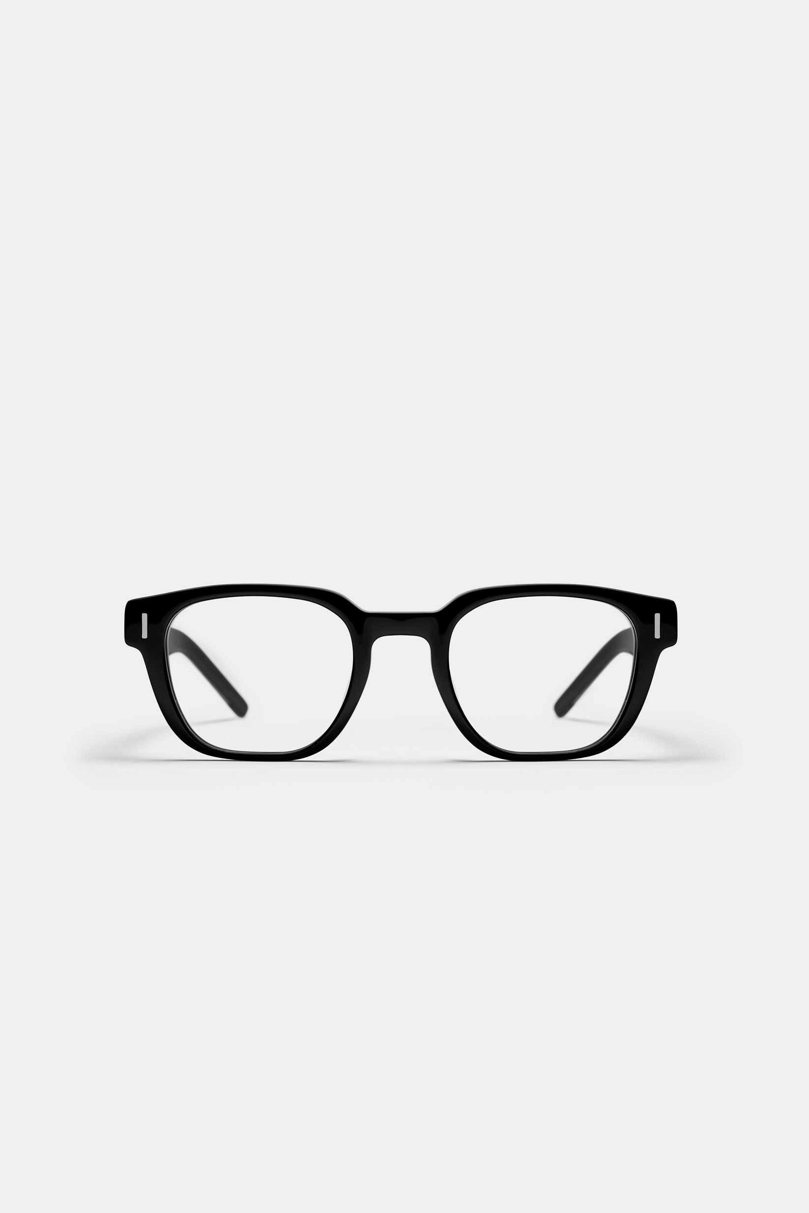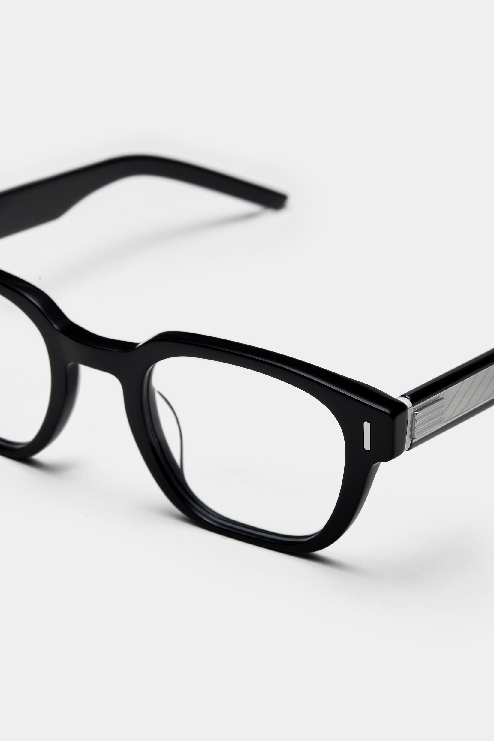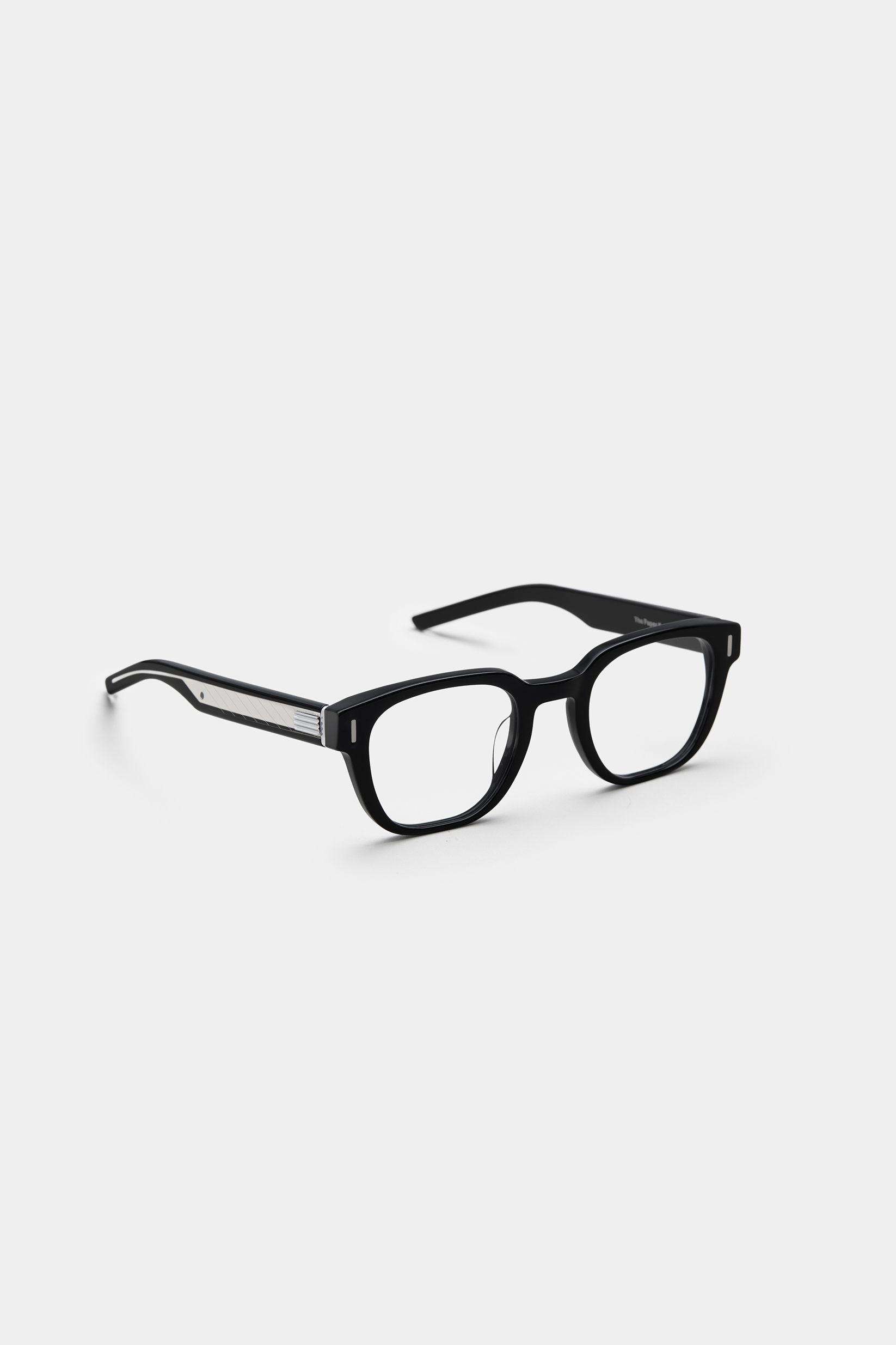 A soft square silhouette with bold acetate rims. The temples feature crisp, linear grooves inspired by the blade of a paper knife, lending a sharp and defined character to the frame.