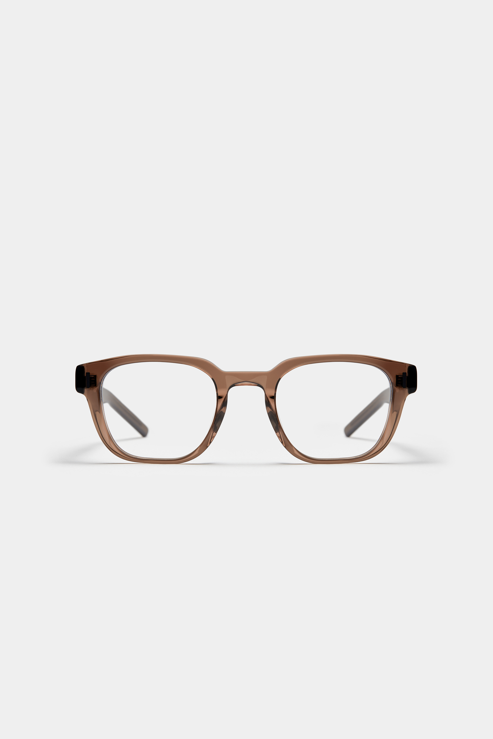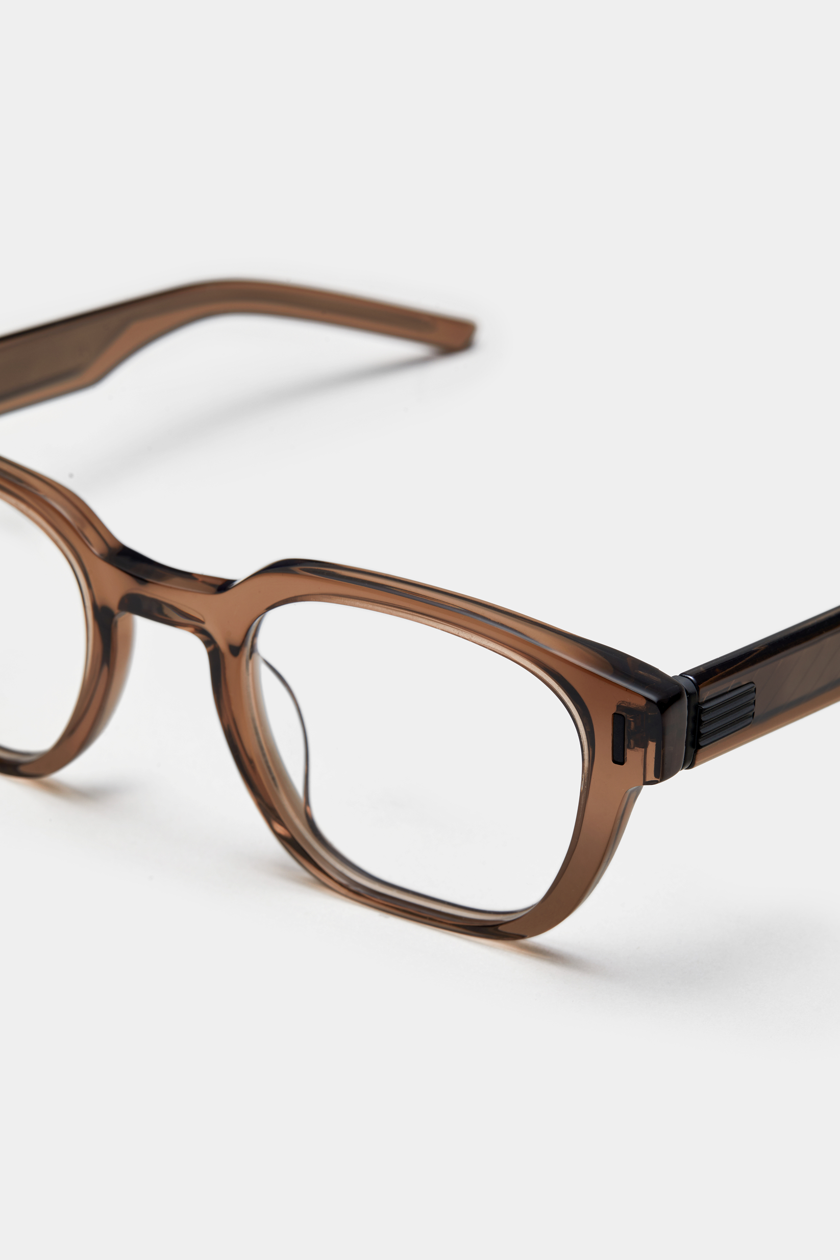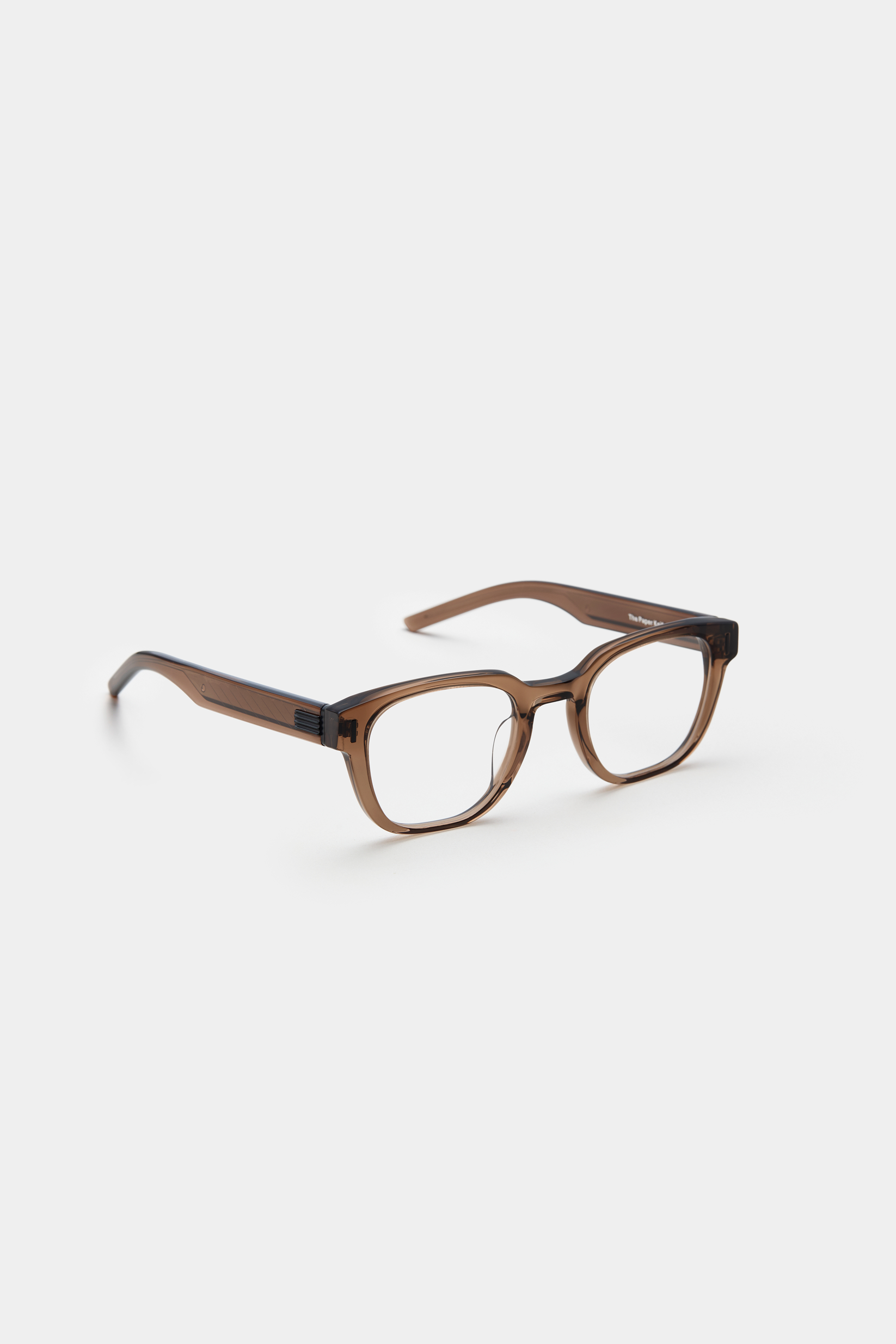 A soft square silhouette with bold acetate rims. The temples feature crisp, linear grooves inspired by the blade of a paper knife, lending a sharp and defined character to the frame.