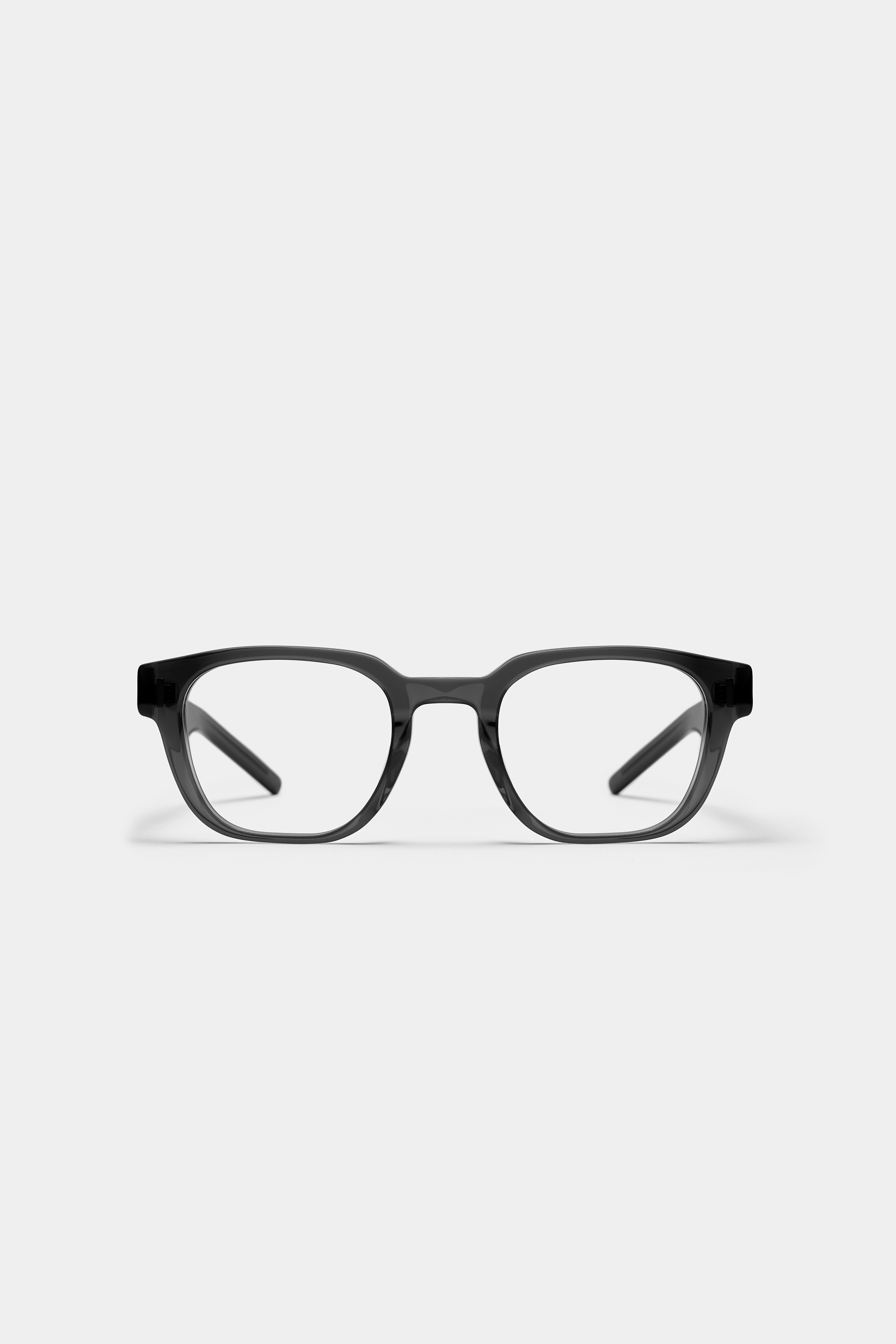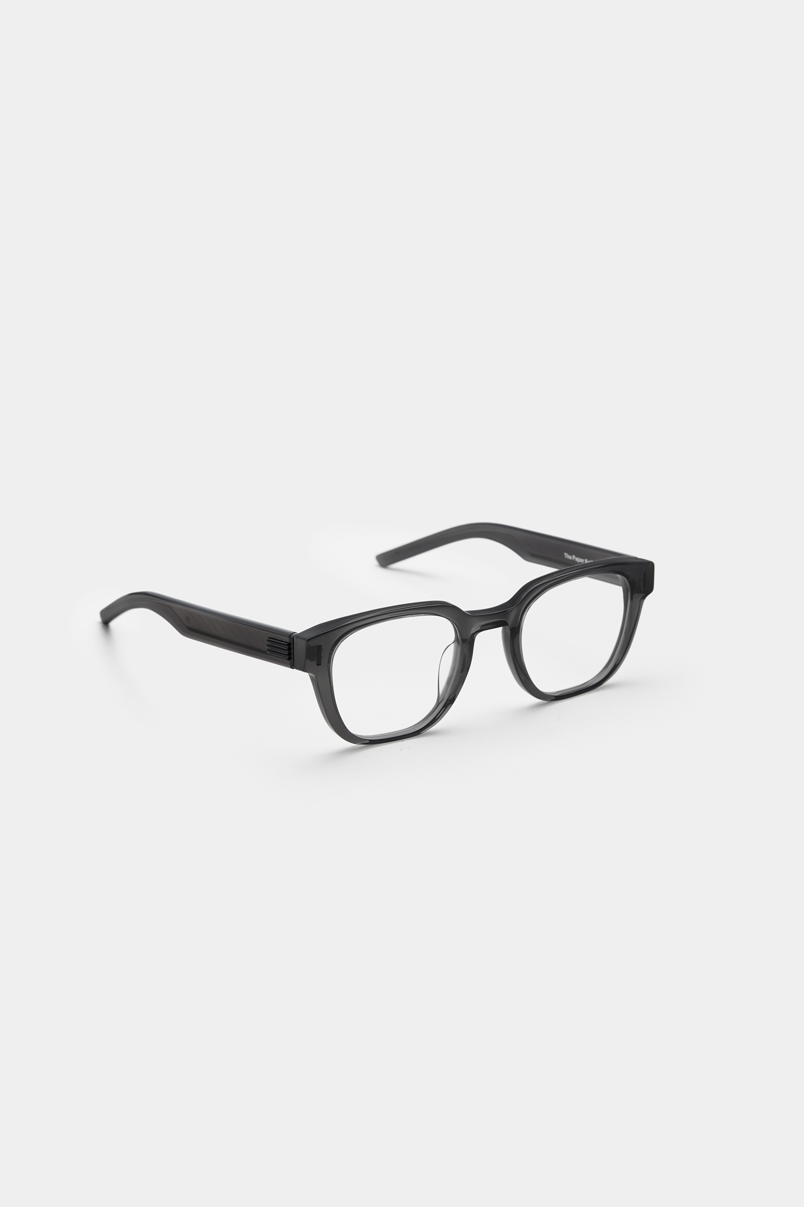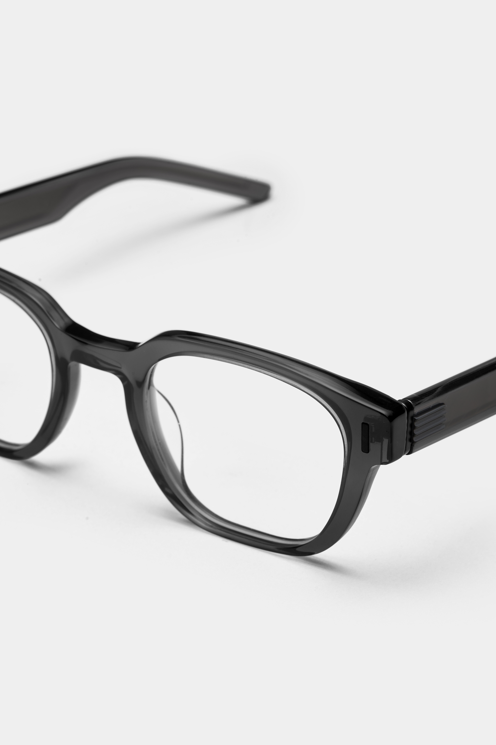 A soft square silhouette with bold acetate rims. The temples feature crisp, linear grooves inspired by the blade of a paper knife, lending a sharp and defined character to the frame.