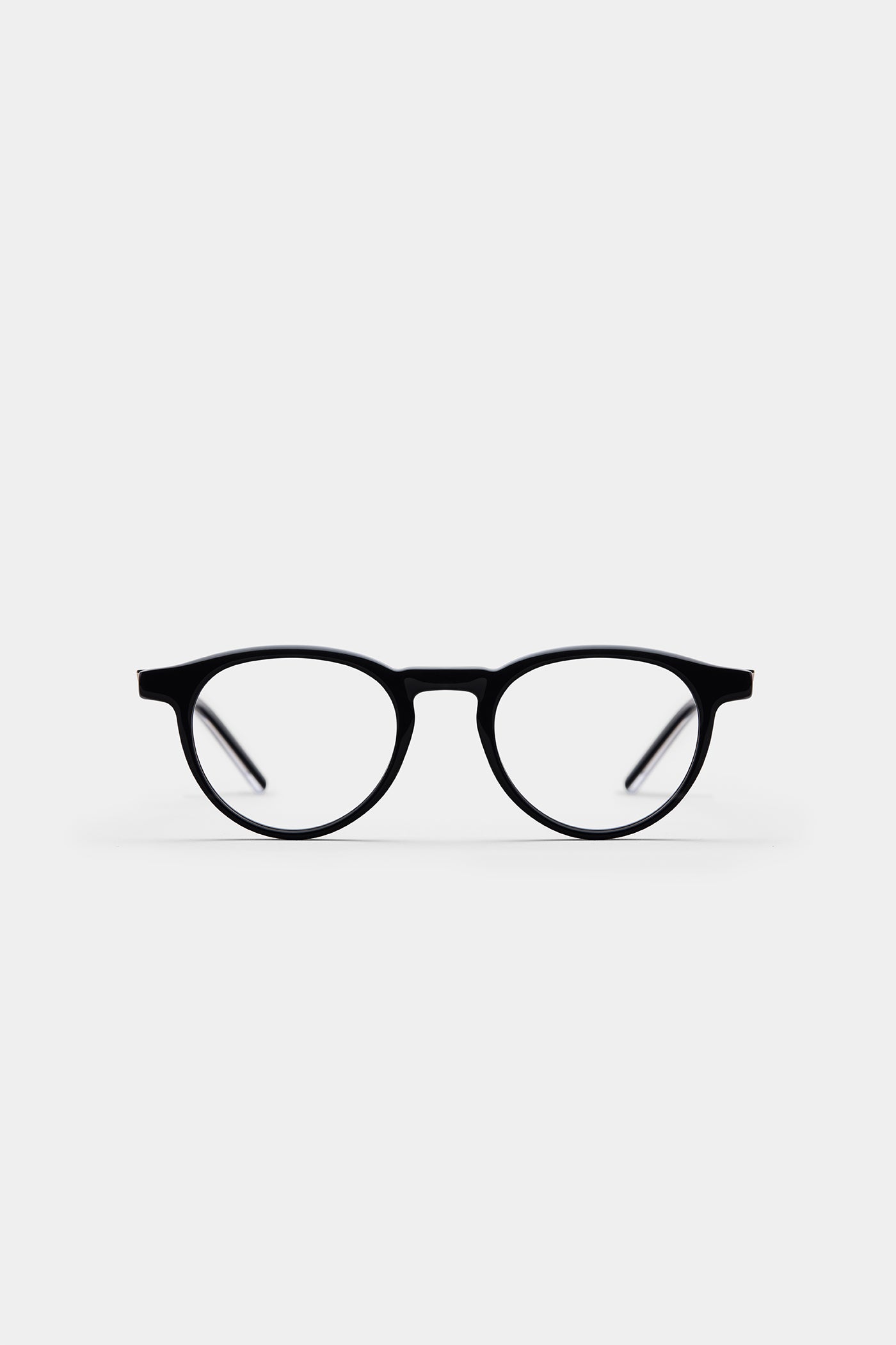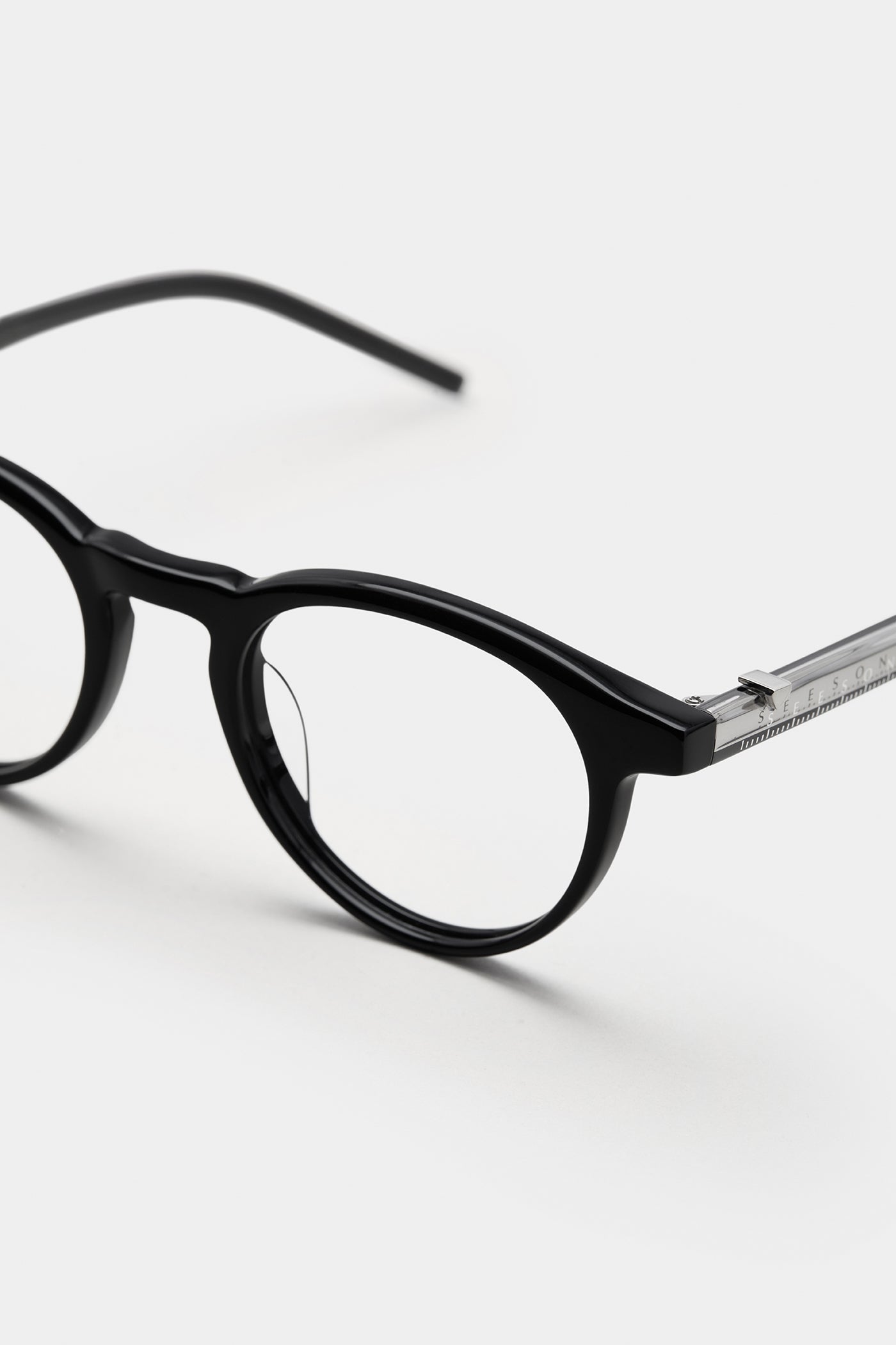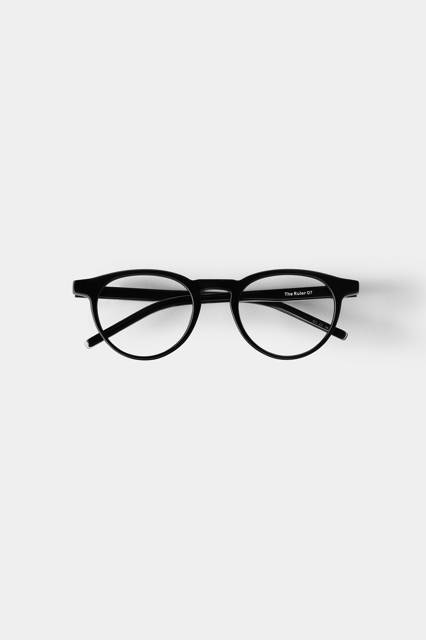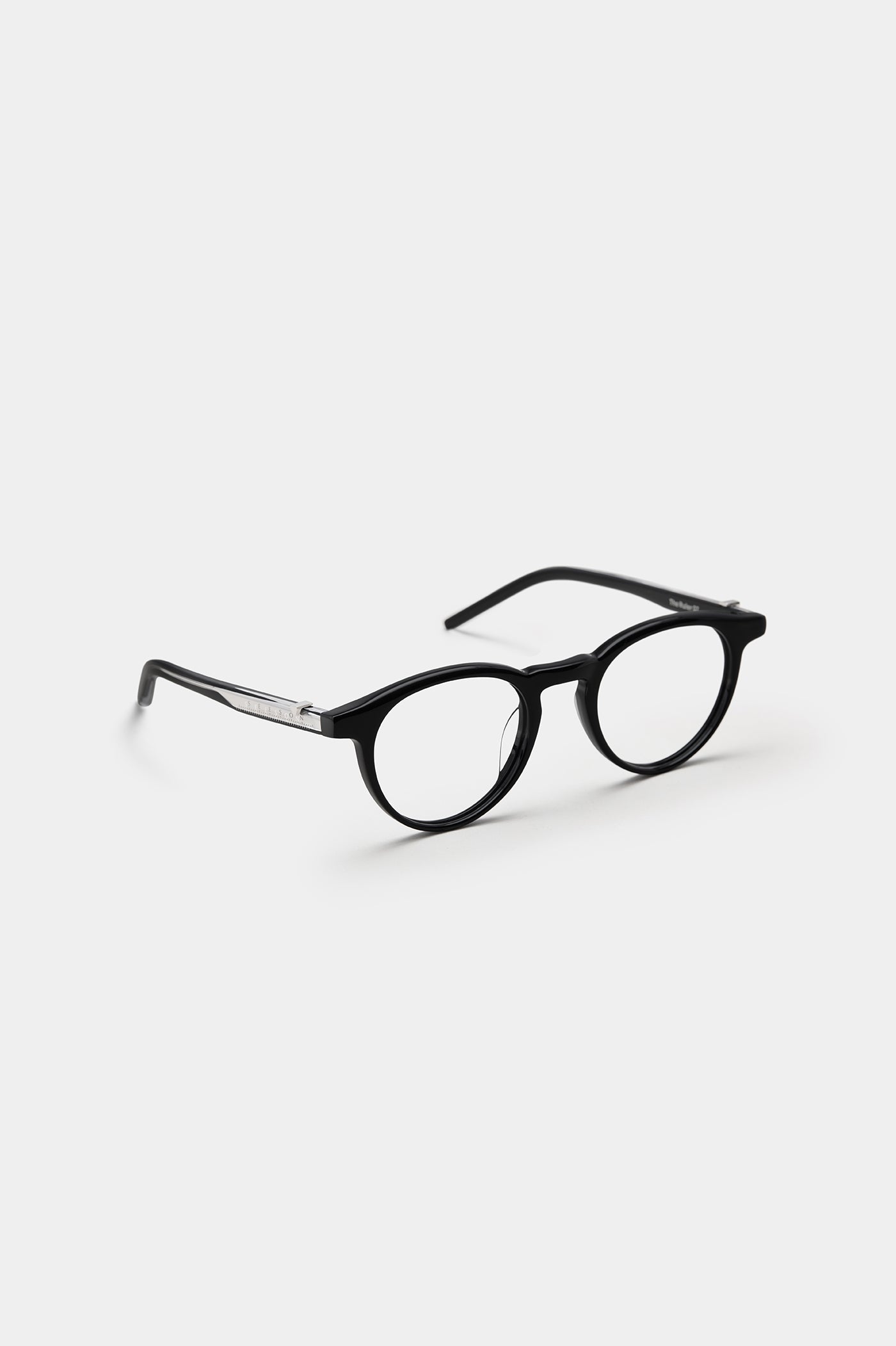 A soft round silhouette with balanced thickness, offering a harmonious look and effortless wear. The temple detail subtly references the form of a scale ruler — a quiet accent within the minimalist composition.
